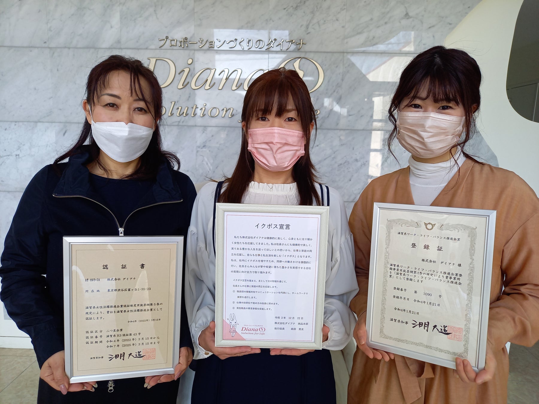 プロポーションづくりの総合コンサルティング企業、株式会社ダイアナ(東京都渋谷区、代表取締役社長 兼 会長: 徳田充孝、以下ダイアナ)は、「滋賀県女性活躍推進企業認証制度」(滋賀県では、女性活躍推進に取り組む企業・団体を応援するために、「滋賀県女性活躍推進企業認証制度」を実施)において2022年3月15日付けで2つ星に認証、「女性のチカラを活かす企業認証制度」(宮城県に事業所を持ち女性活躍推進に取り組む企業・団体がその実績に応じて宮城県より認証される)において2022年4月1日付でゴールド認証企業に認証されました。