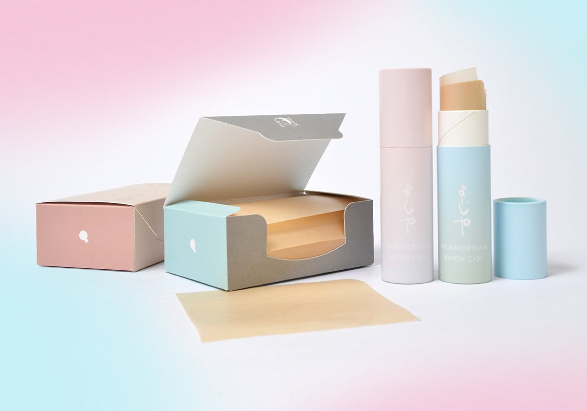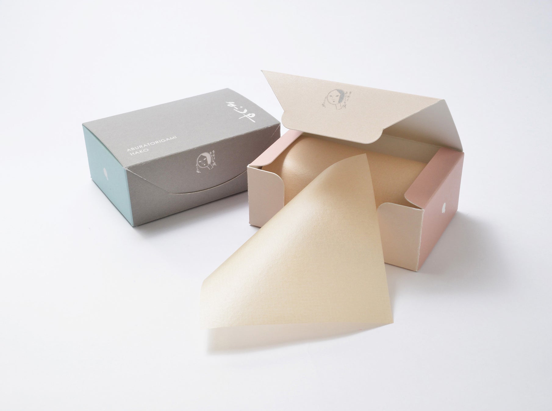 今回はこれまでの冊子状から大幅に変更し、箱型と筒形のパッケージに入った、より使いやすいあぶらとり紙となっております。