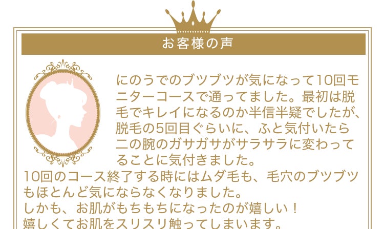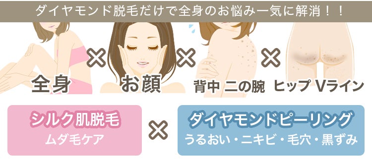 ムダ毛をなくすだけでお肌をキレイにすることができなかった従来の脱毛に、ダイヤモンドピーリングケアを加えることで今までは実現できなかったお肌の黒ずみヒップラインや背中のブツブツなども解消し、肌触り滑らかなお肌に導く「ダイヤモンド脱毛」を新開発しました。