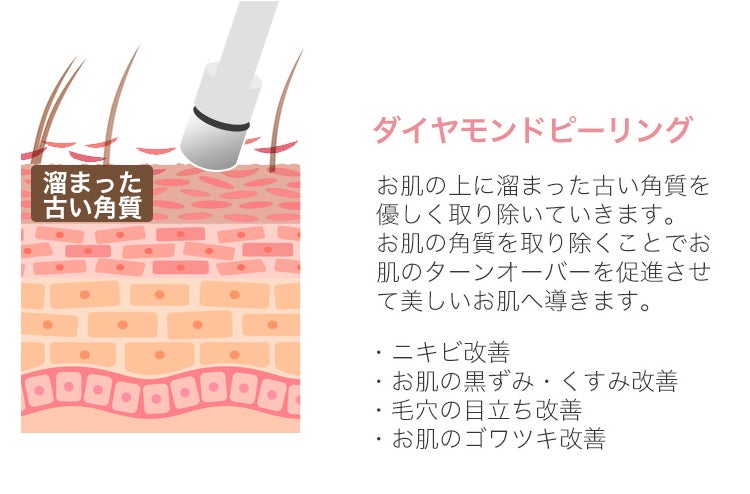 ハイパースキン美肌脱毛に加え、お肌の古い角質をダイヤモンドの繊細な粒子で優しく取り除く「ダイヤモンドピーリング」を組み合わせた全く新しい脱毛法です。