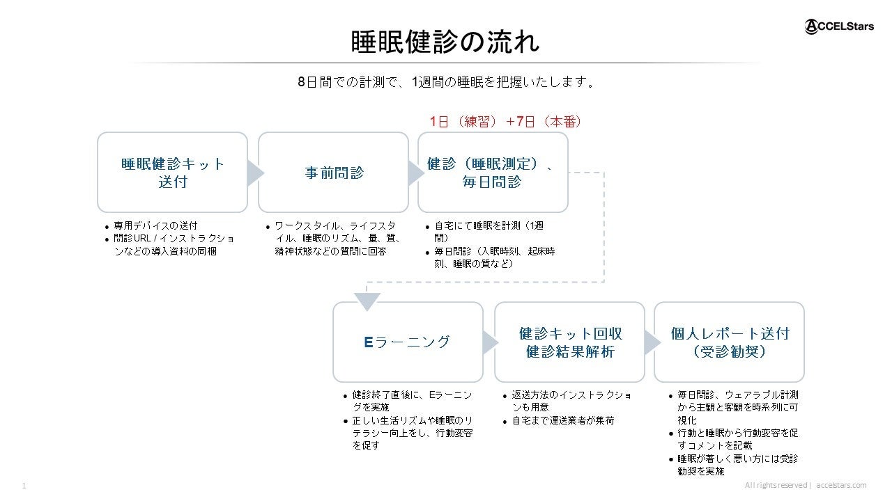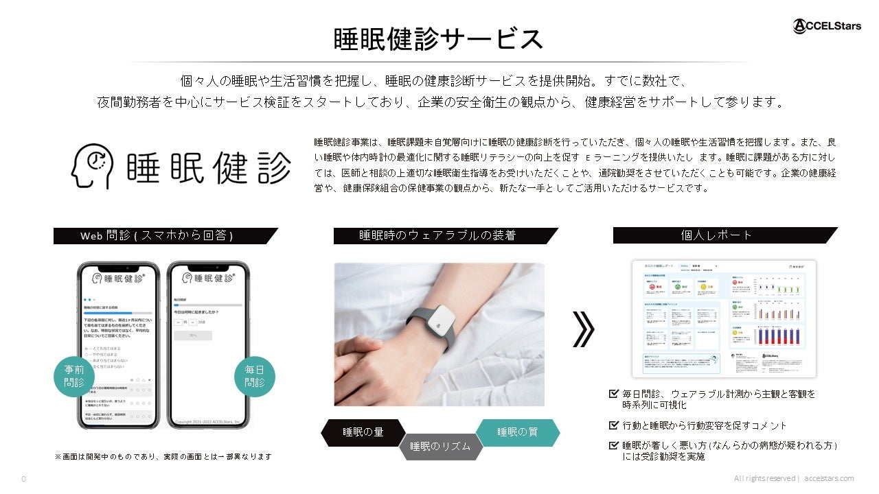ACCELStarsの代表の宮原は、「睡眠健診をご提供することにより、働き手世代の多くの方々に睡眠を正しく理解し、有所見者には睡眠衛生指導を受けていただくことによって、正しい睡眠の量、質、リズムを理解し、行動することで、疾病予防にもなりますし、メタボにも効果があります。共にサービス提供いただける健診機関を募集し、全国に展開していきたい」とサービス開発、拡大に期待を込めた。