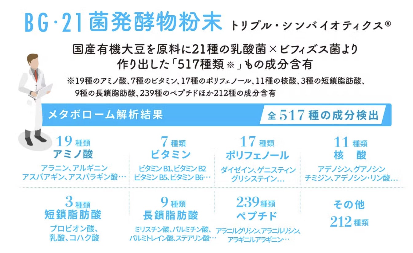 本製品の主成分である日本品質の乳酸菌生産物質「BG・21」との偶然の出会いから、大腸が健やかになると様々な可能性があることを知りました。その中でも脳と腸の相関関係により、大腸は幸福感にも影響があるかもしれないというのです!BG・21には517種もの乳酸菌生産物質が入っており、その中にはセロトニンが含まれています。※「BG・21」は株式会社バイオジェノミクス様の特許原料です。
