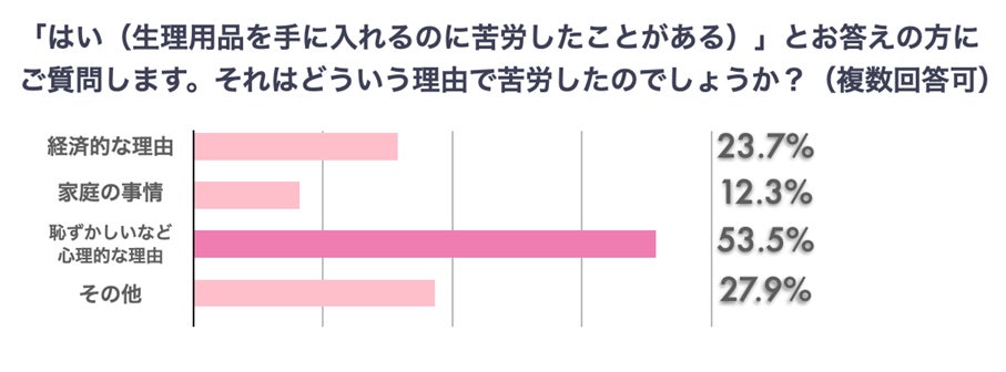 続いて「生理用品を手に入れるのに苦労したことがある」と回答した理由を質問したところ、最も多い回答は「恥ずかしいなど心理的な理由」が53.5%と過半数を占め、次いで経済的な理由(23.7%)、家庭の事情(12.3%)という結果となりました。