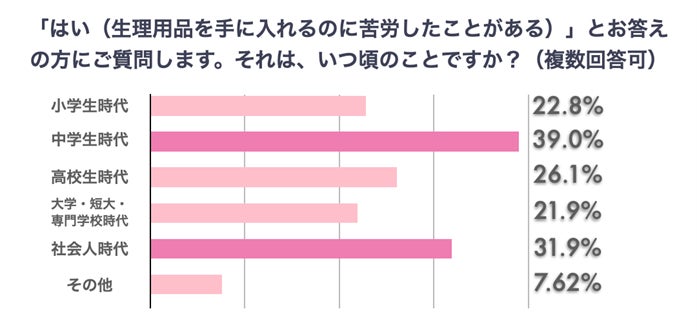 さらに「生理用品を手に入れるのに苦労したことがある」と回答した人にその時期について質問したところ、「中学生時代」(39.0%)が最も多く、次いで「社会人時代」(31.9%)、「高校生時代」(26.1%)という結果となりました。