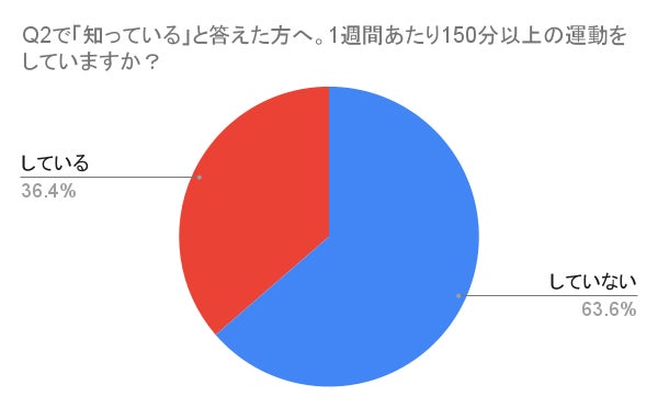 Q2で「知っている」と回答した方の中で1週間に150分以上運動している方は、36.4%と5割を切っていました。