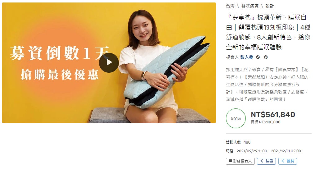 台湾のクラウドファンディングで約240万円(561,840 ニュー台湾ドル)の支援を集めたまくらです。