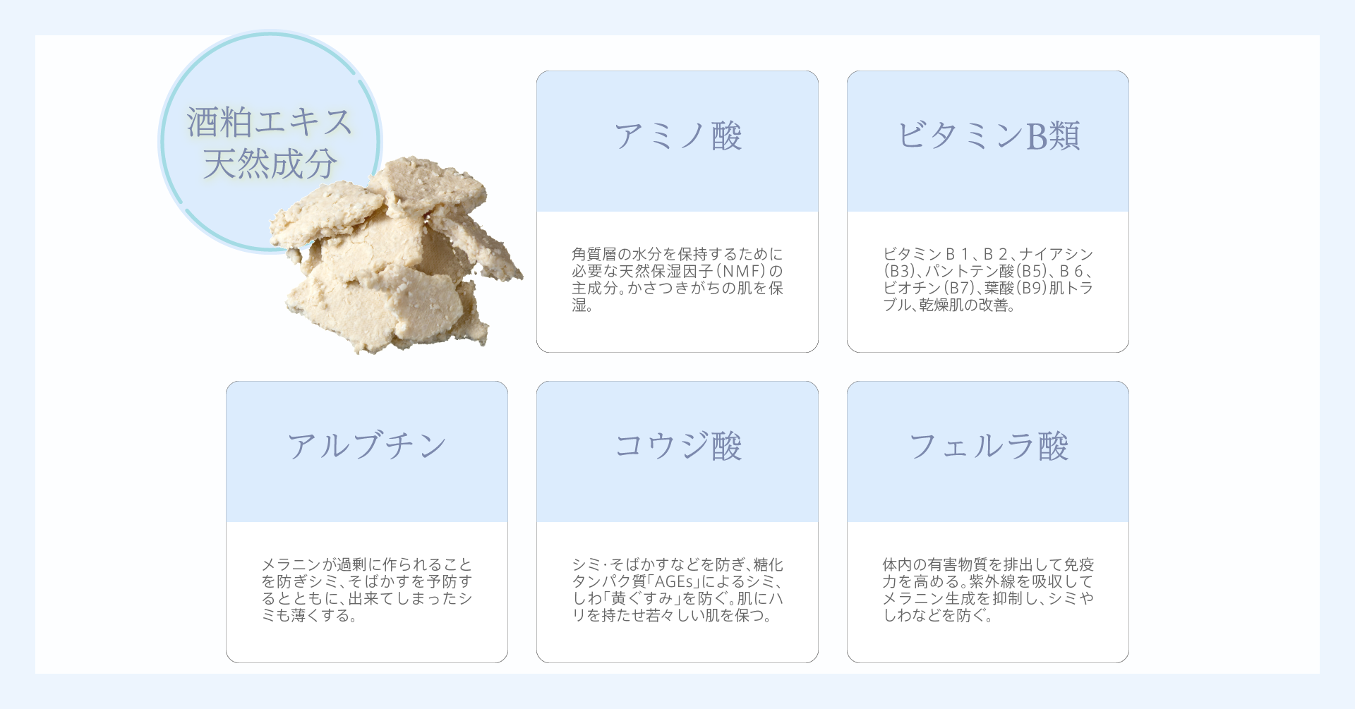 日本酒造りの杜氏さんは美肌の人が多いとか。その秘密が酒粕にあるそうです。その酒粕から独自の手法で有効成分を抽出することに成功。 酒粕は、日本酒よりも栄養価が高く、美肌に効果的なアルブチンやフェルラ酸、コウジ酸などの天然成分を多く含み、若々しい肌を保ちます。