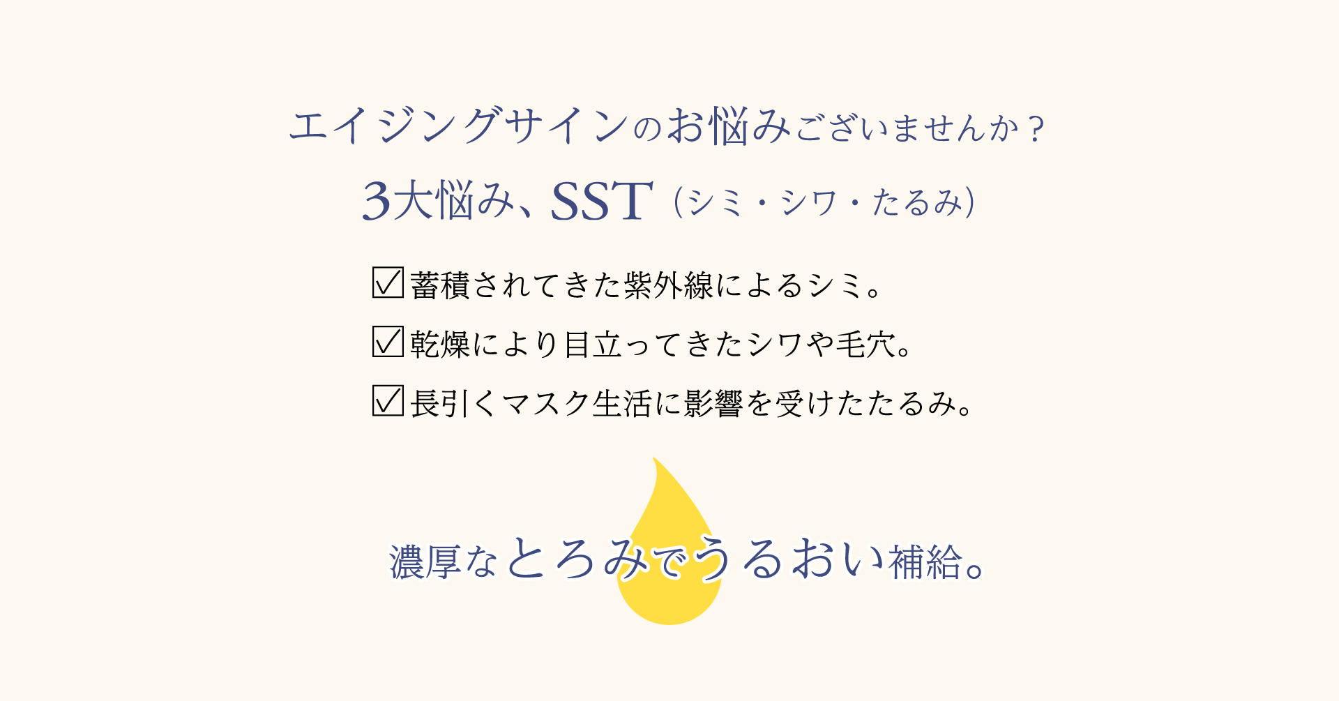 • エイジングサインの3大悩み、SST(シミ・シワ・たるみ)