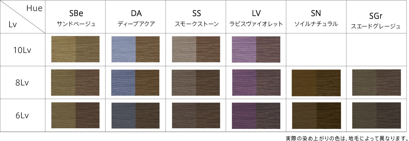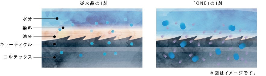 これまでよりも大きく鮮やかなブルー染料と、小さく穏やかなヴァイオレット染料を掛け合わせ新たなベースカラーを設計。大きさの異なる染料が髪内部を効率的に埋めることで、10分で赤みを抑えつつ、毛先までやわらかく透明感のある発色を可能にしています。