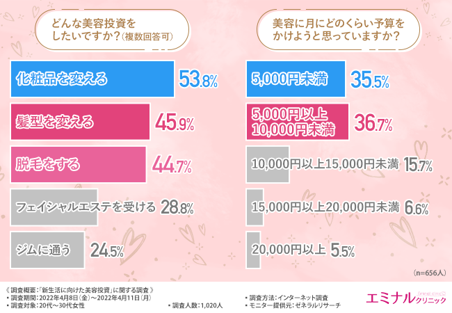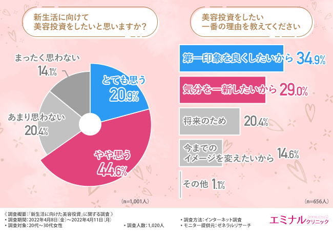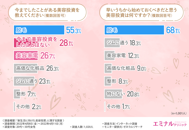 そこで今回、医療脱毛のエミナルクリニック(https://eminal-clinic.jp/lp01/?refmedia=11073)は、20代~30代女性を対象に、「新生活に向けた美容投資」に関する調査を実施しました。