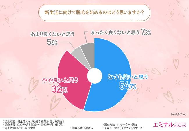 そこで、「新生活に向けて脱毛を始めるのはどう思いますか?」と質問したところ、『とても良いと思う(54.7%)』と回答した方の割合が最も多く、次いで『やや良いと思う(32.1%)』『まったく良くないと思う(7.3%)』『あまり良くないと思う(5.9%)』と続きました。