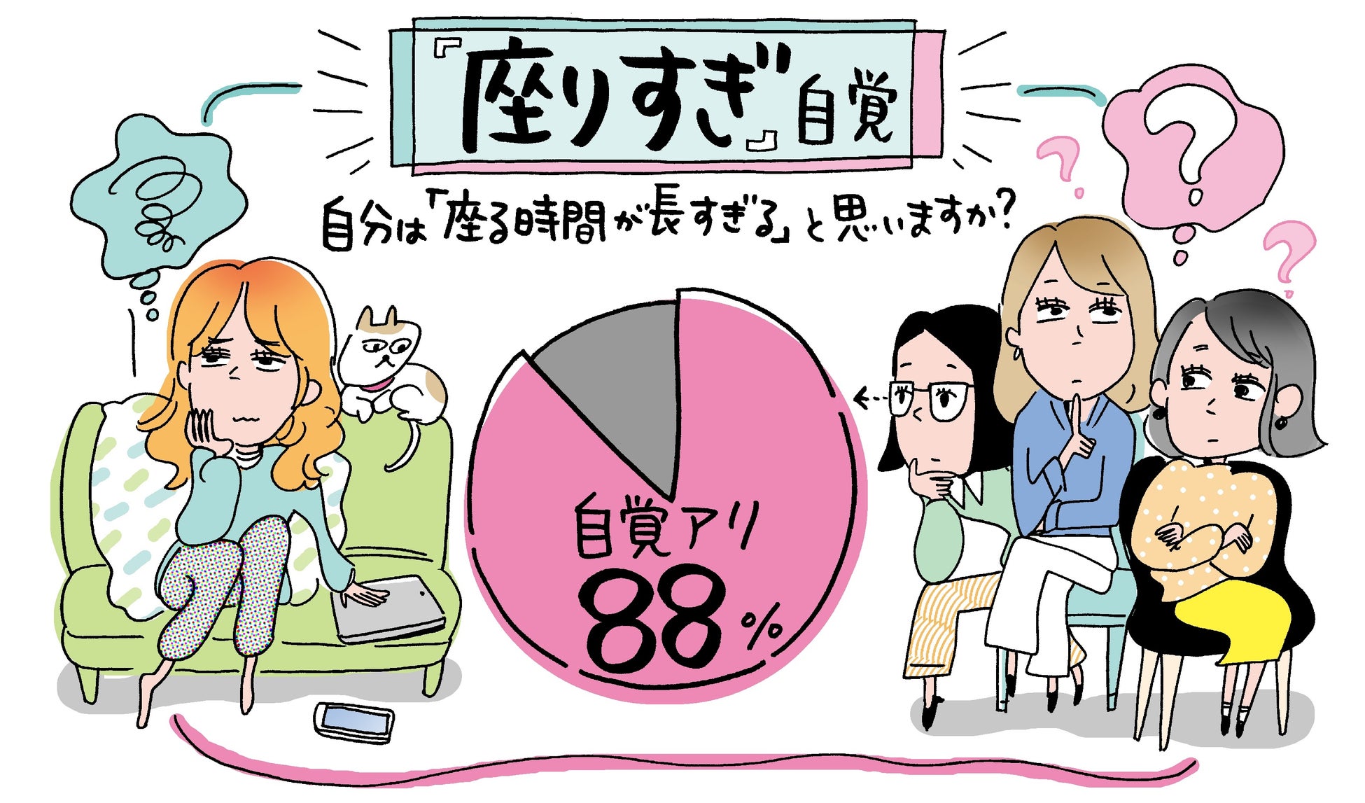 ◆ 9割が「座りすぎ」を自覚。デスクワーク女性の平均「イス時間」は1日約9時間… 年間で約122日にも