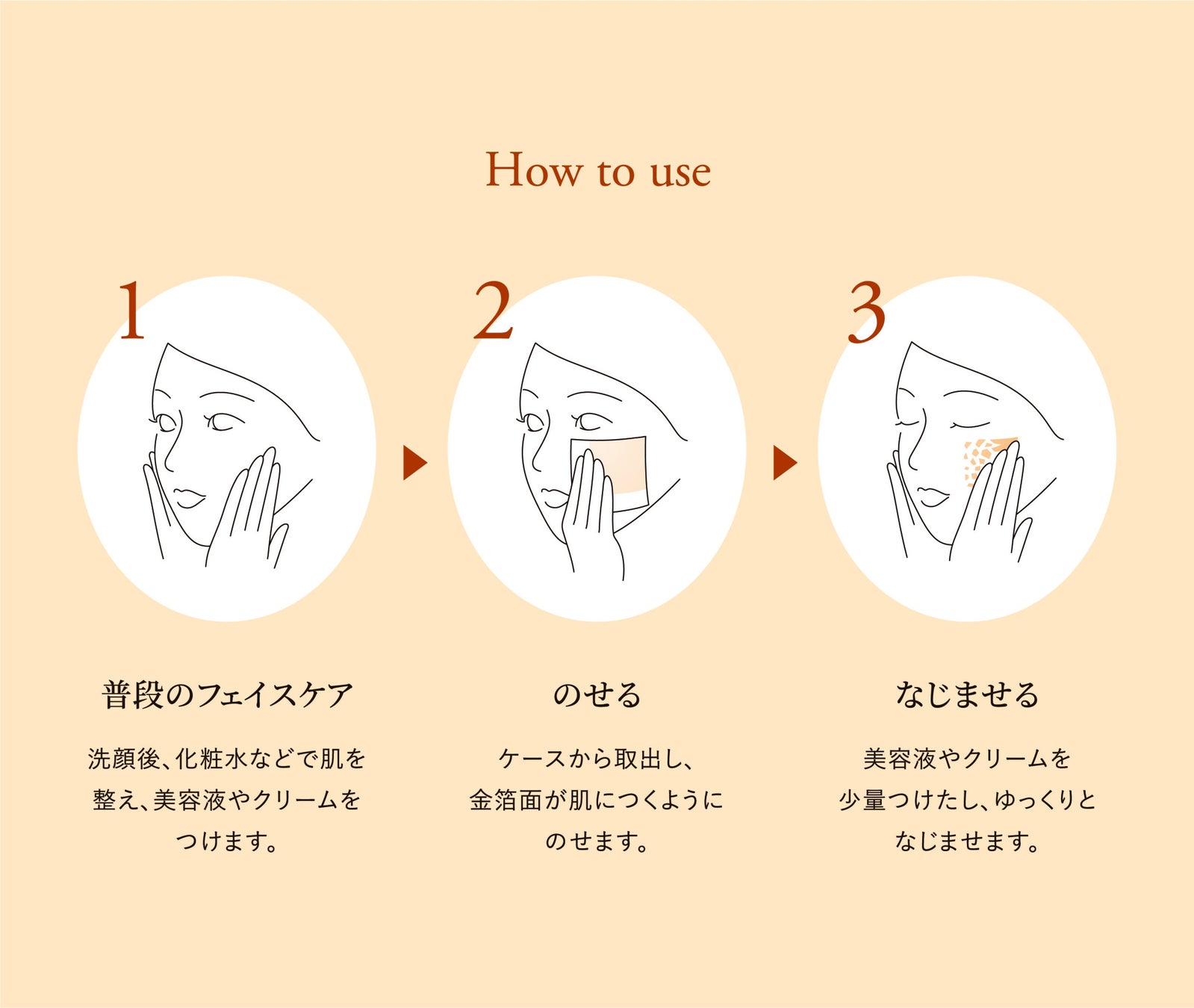 極薄の金箔をしなやかな特製紙と密着させました。取扱いが難しい金箔をもっと簡単、手軽に扱える仕様になり、化粧品で整えた肌に金箔をきれいにおくことができます。また、この仕様変更によりプラスチック製資材の削減につなげることができました。