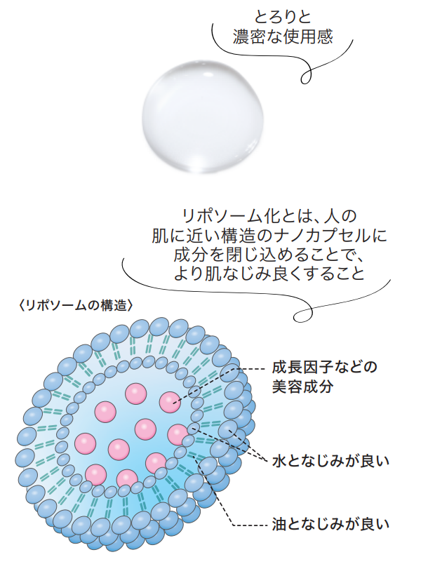 水なしプラセンタ(※5)をリポソーム化・高濃度化し、角層が厚く硬くなりがちな大人の肌へも高浸透※9・高実感しやすくしたのが「ディープ プラセンタエキス(※5)」です。今回の新製品にも、同成分を従来の原液美容液と同濃度配合しています。