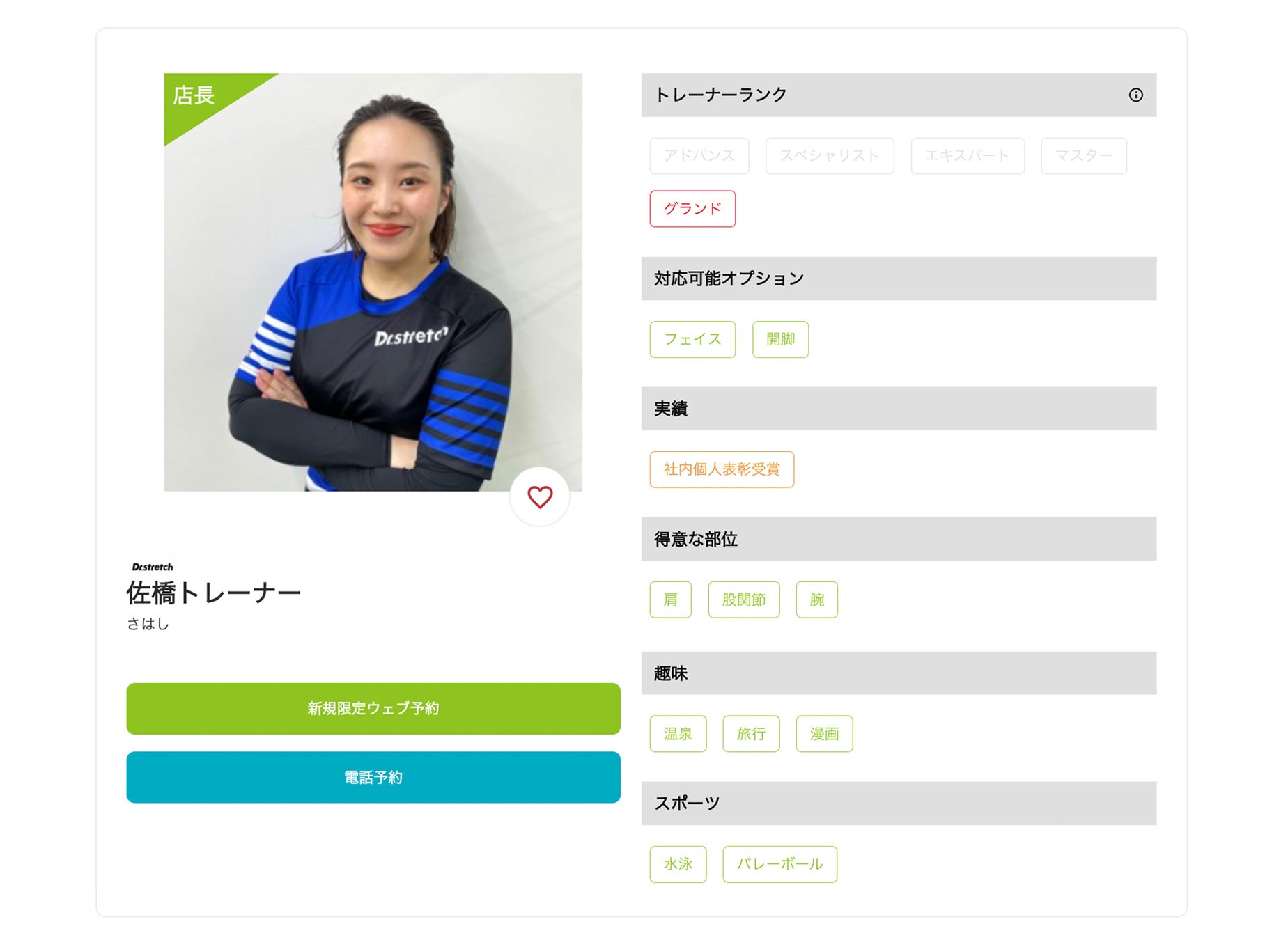 本機能により、初回予約のお客さまがご自身にあったお身体のお悩みやスポーツ経験などからトレーナーを検索・指名が可能になりました。このようにトレーナーの情報をオープンに見える化することで、より「Dr.stretch」の店舗にお越し頂くお客様ひとりひとりの健康状態やニーズに寄り添ってまいります。