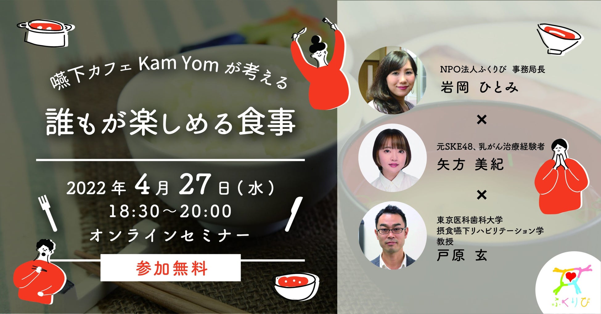 プロジェクトの立ち上げと、矢方美紀さんのプロデューサー就任を記念しまして、4月27日(水)18:30より『嚥下食カフェKam Yomが考える「誰もが楽しめる食事」』と題したセミナーを開催いたします。摂食嚥下リハビリテーションの最前線で活躍する戸原玄教授(東京医科歯科大学)に、大手外食チェーンや食品会社も取り組む嚥下食の最新事情についてお話しいただきます。また、本セミナーには矢方美紀さんを迎え、がん治療中に食事で困ったことや工夫について、そして今がん治療中の方々に向けたアドバイスなどを含めて、戸原先生との対談形式でお届けします。