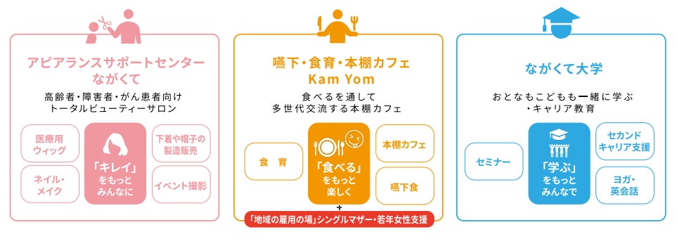 また、同施設はカフェのほか、最大6,000冊収容可能な本棚も併設。「ながくて大学」と題した、本を通した学びや交流を楽しめる催しを開くなど、地域の方々の学習活動を支援いたします。さらに、NPOふくりびがこれまで行ってきた事業である美容室、アピアランスサポートセンター*2も併設するなど、日本初の福祉複合型の施設*3となります。