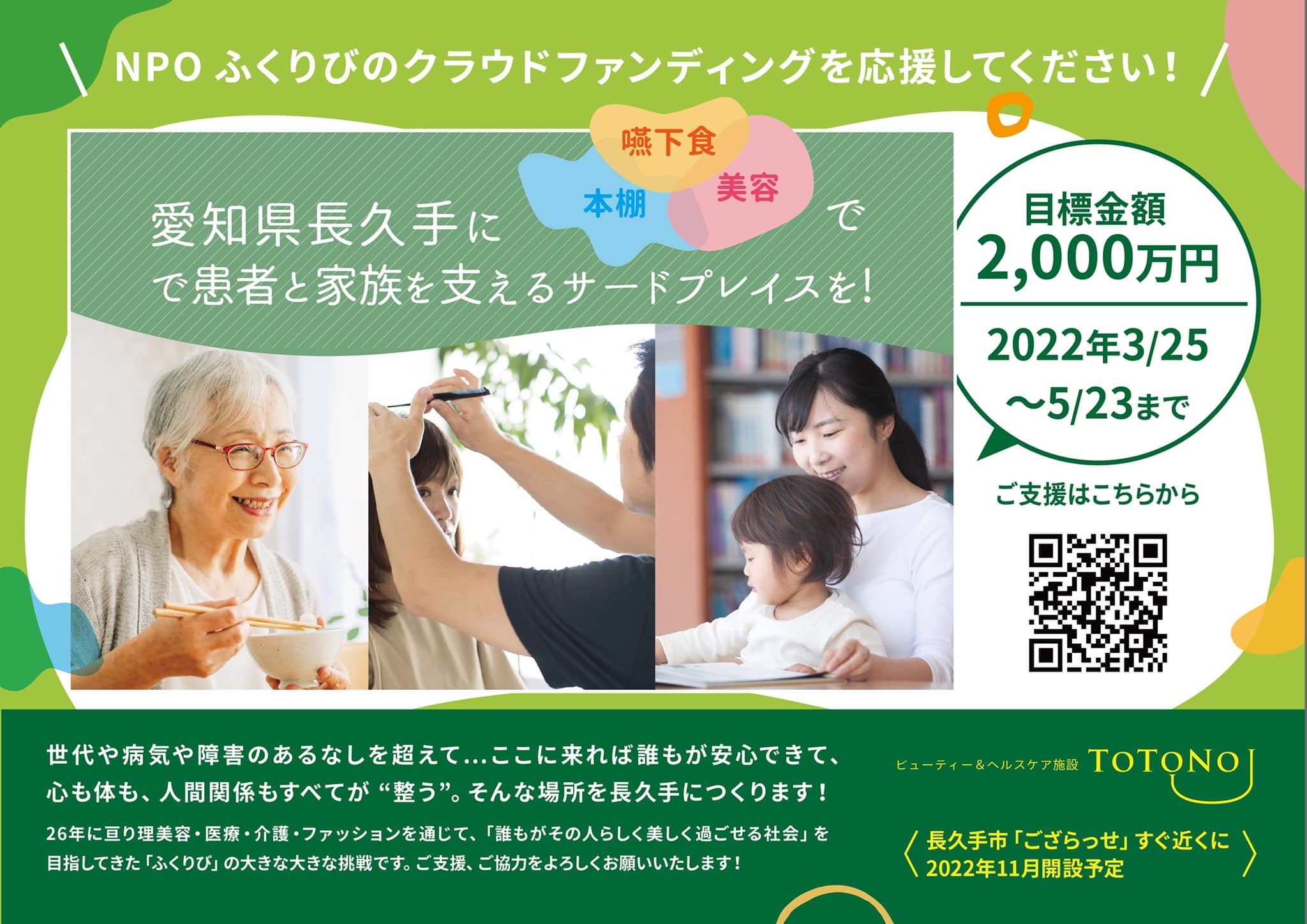 NPO法人ふくりびは、「誰もがその人らしく、美しく過ごせる社会の実現を目指して」という理念のもと、これまで26年にわたって、福祉理美容(高齢者や障害のある方の自宅や施設への訪問理美容・がん患者さんのアピアランスサポートなど)に取り組んできました。愛知を拠点に、日進市や長久手市近郊の100箇所以上の介護施設、障がい施設に訪問しているほか、医療用ウィッグの製作やヘアセットなど、治療による副作用や障害に悩む方々をサポートする「あぴサポあいち(アピアランスサポートセンターあいち)」と「あぴサポTOKYO」の運営もしています。