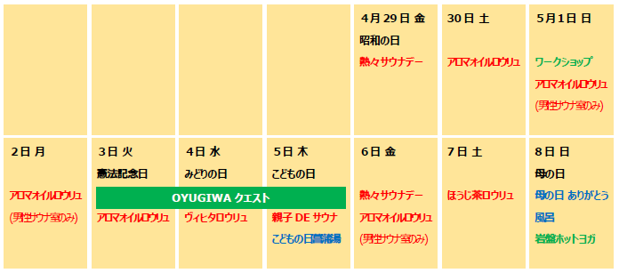 - OYUGIWAゴールデンウィーク イベントカレンダー