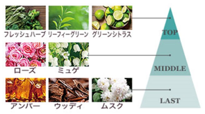 トップノートはフレッシュハーブ、リーフィーグリーン、グリーンシトラスが爽やかに。
