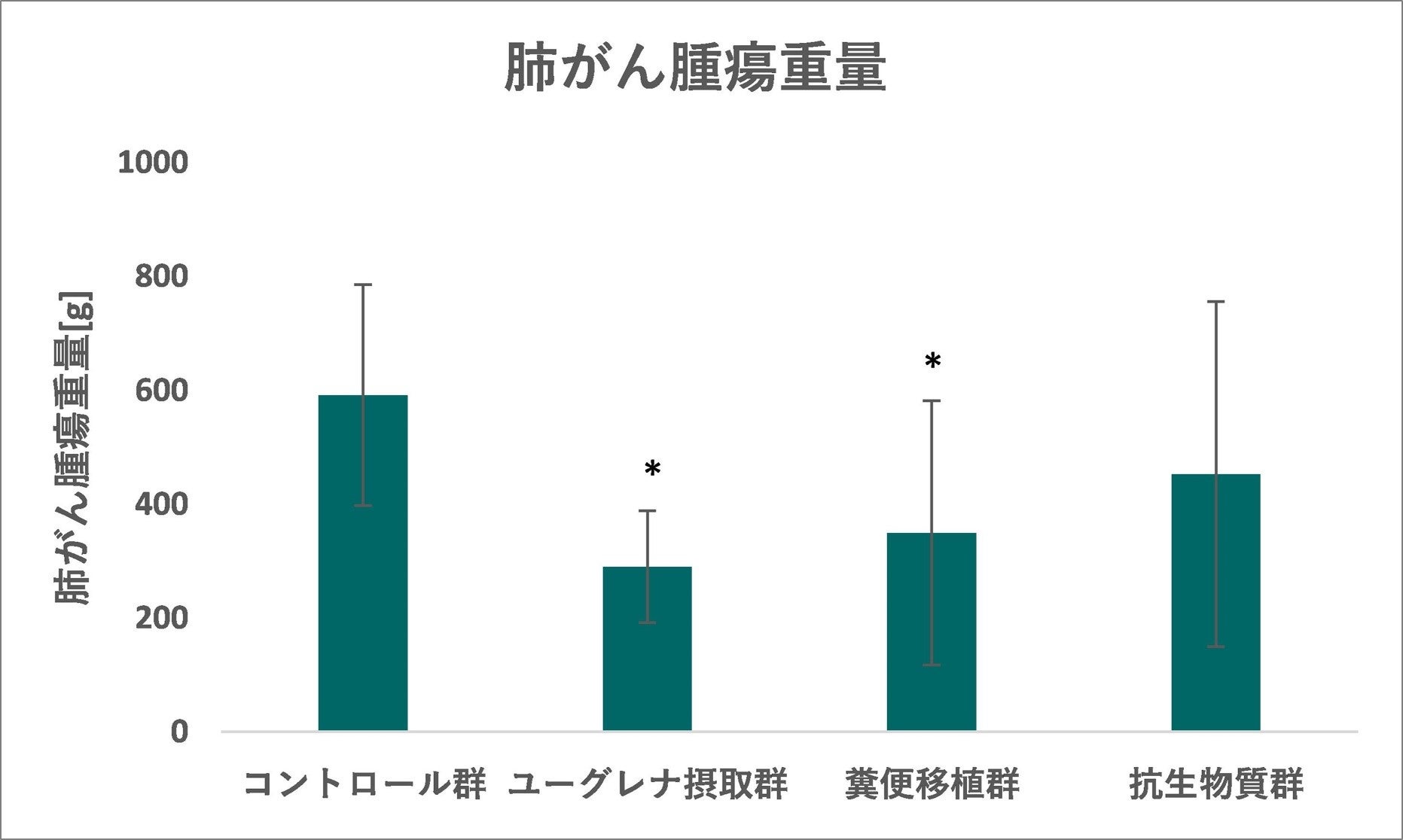 ユーグレナの抽出物を摂取させたマウスの糞便を別のマウスに移植することで、ユーグレナ抽出物を摂取していた場合と同程度まで肺がんの腫瘍重量が抑制され、ユーグレナ抽出物による肺がんの腫瘍重量の抑制は、抗生物質により腸内細菌叢を除外することで見られなくなりました