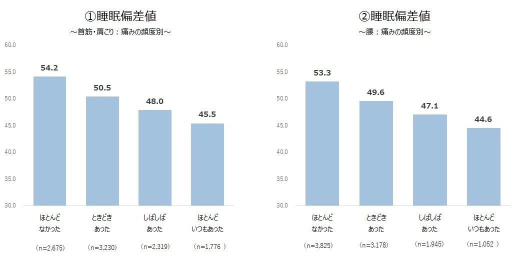 また、上述の痛みの頻度と睡眠偏差値を分析すると、痛みの頻度が高いほど睡眠偏差値が低下する傾向が明確にうかがえました。