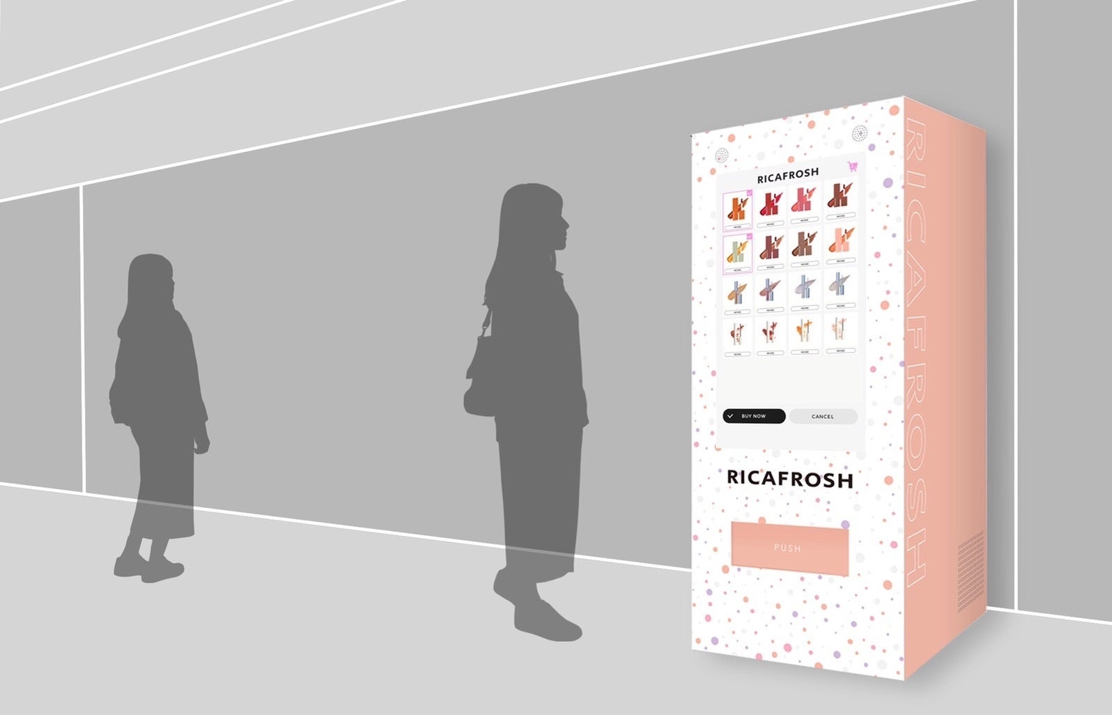 今回活用するコスメ専用大型自動販売機「PRENO」では、大型のタッチパネルを通して商品の選択や購入を行うことで、複数商品の同時選択・購入が可能になり、ユーザーはECサイトで買い物をするような流れで商品を購入することができます。自販機の外側にはRICAFROSHの商品パッケージを彷彿とさせるデザインを施し、大モニターではブランドムービーを放映。ご購入時にランダムで商品やクーポンの特典が付いてくる仕組みなど、RICAFROSHが表現する世界観を楽しんでいただける仕掛けを施しました。各種キャッシュレス決済にも対応し、ブランドとしてこれまで接触がなかったユーザーにも、新たにブランドを知っていただくと共に、手軽に購入いただけるような場として展開いたします。