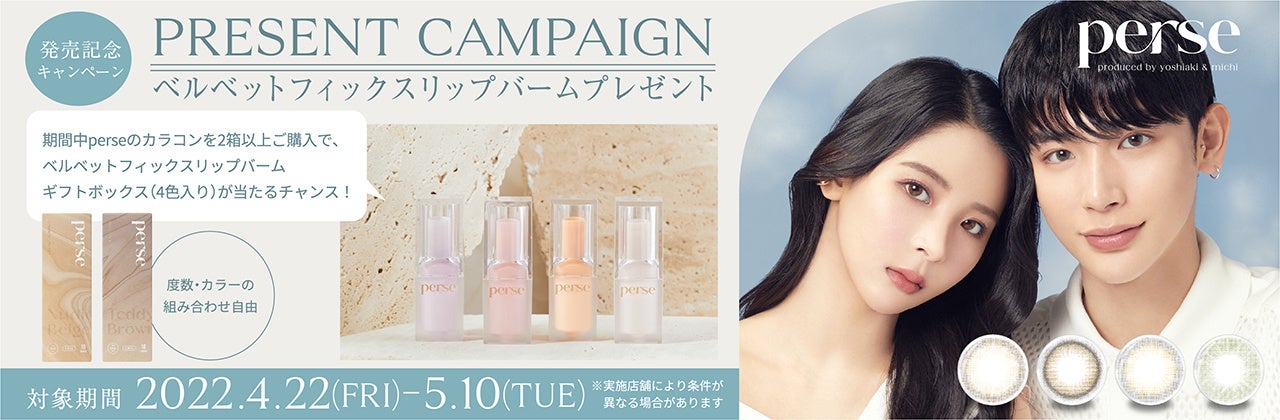 ミチ・よしあきプロデュースブランド『perse』より、新たにカラーコンタクトレンズが発売されたことを記念し、2月に発売して以来話題の『perse ベルベットフィックスリップバーム』全4色セットが当たるキャンペーンを実施いたします。