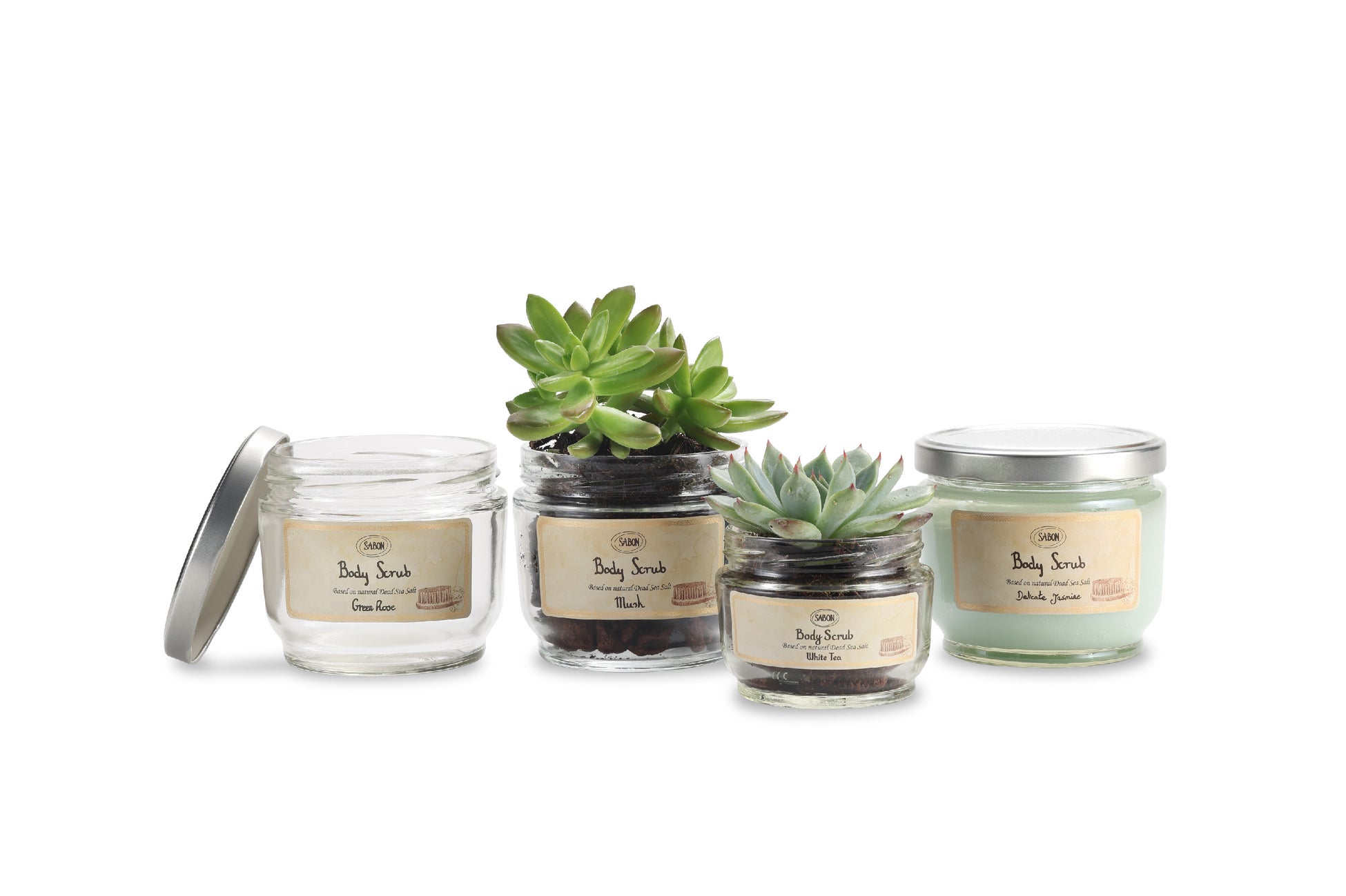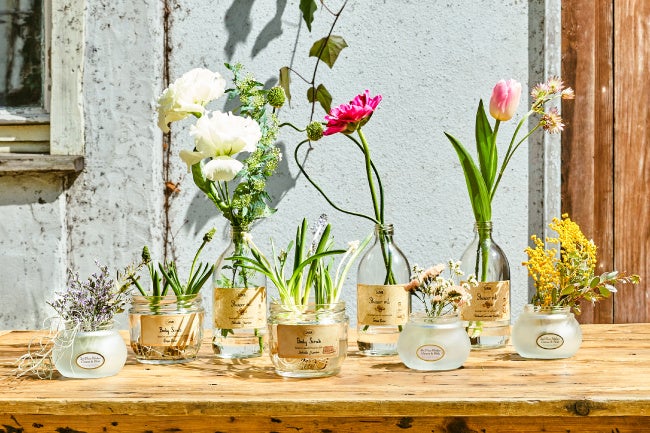 土と一緒にSABON製品の空きガラス容器に入れて水をやると、小さな芽が出て、やがて色とりどりの花が咲きます。*