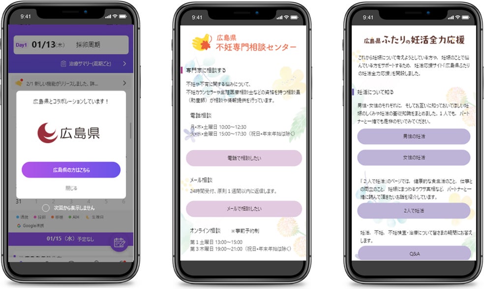さらに、広島県の社会課題解決・イノベーション創出を支援する「RING HIROSHIMA」に採択いただき、活動内容を検討してまいりました。広島県では、これまで不妊や不育に悩む夫婦や家族に対し、不妊・不育に関する専門的な相談や心の悩みなどについて専門の相談員(助産師)がお応えする「不妊専門相談センター」や、男性・女性それぞれに知って欲しい基礎知識や助成制度などを詳しく紹介する「広島県ふたりの妊活全力応援」サイトを開設しています。当社では、このような有用性の高い情報サイトをより多くの方に知っていただくため、当社アプリ「cocoromi」内に、広島県在住の方向けに上記サイトを紹介する特設ページを開設することになりました。