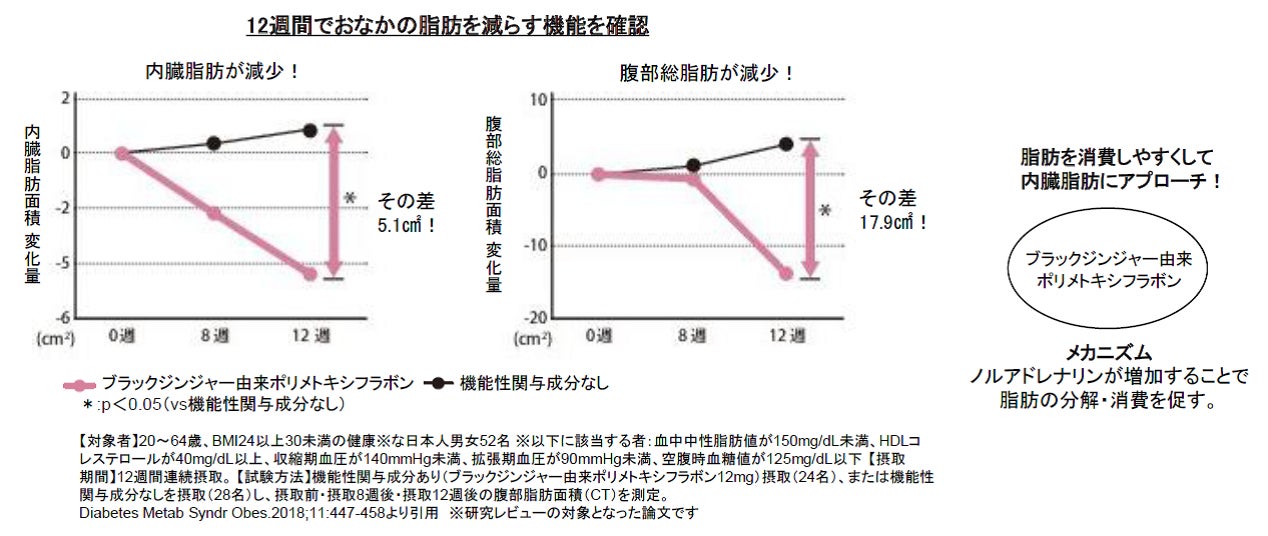 4つの機能性関与成分がチカラを発揮。腹部皮下脂肪や内臓脂肪にアプローチして、お腹の脂肪を減らします。「植物由来カプセル」を使用し、配合成分を適切な場所で溶け出るように設計しています。