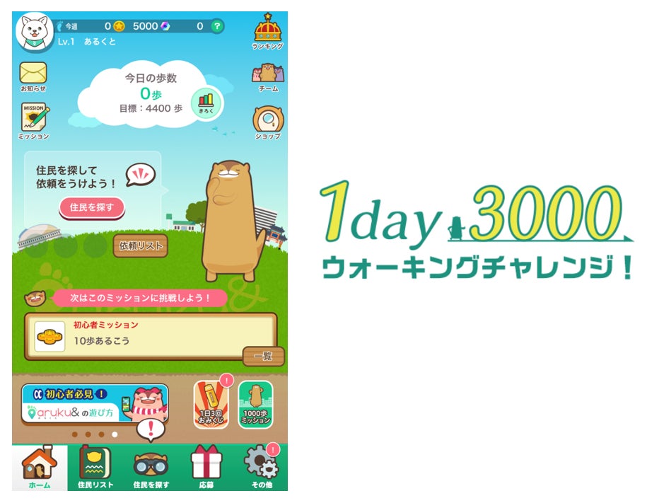 2016年11月より、株式会社ONE COMPATH(当時、株式会社マピオン)が運営している、「歩くことが楽しくなる」仕掛けが満載のウォーキングアプリです。アプリ内に登場する様々な住民キャラクターに話しかけると依頼が出され、クリアすると、地域名産品などが当たるプレゼントキャンペーンに応募できます。健康増進施策を進める自治体や企業、家族や友人同士などチームでの参加も可能。ユーザー数は累計150万人(2022年4月現在)で、男女問わず20代から50代まで幅広くご利用いただいています。