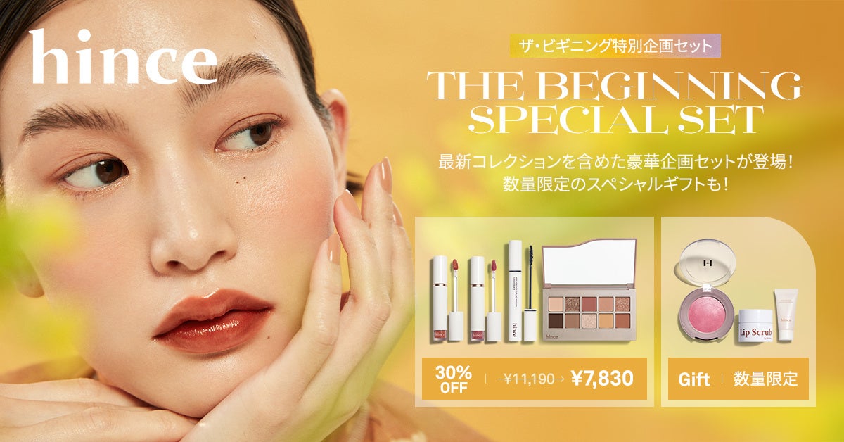 化粧品販売を行うVIVAWAVE Co.,Ltd.(所在地:韓国・ソウル特別市、代表者:Heo Jaeseok)が企画・販売するMood-Narrativeメイクアップブランド「hince(ヒンス)」 は、ゴールデンウィークに向けて日本限定となる特別企画セット「ザ・ビギニング特別企画セット」を4月28日(木)17時よりhince公式オンラインストア(http://hince.jp/)、楽天市場、Qoo10にて発売いたします。さらに、購入特典として日本初登場のアイテムを含めた豪華なノベルティを数量限定で展開いたします。