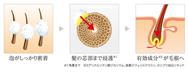 有効成分をたっぷり含んだ泡が髪と頭皮に密着し、1人につき約10万本あるといわれている髪から芯部、さらに毛根へのアプローチを目指し、発毛促進や育毛へと導きます。