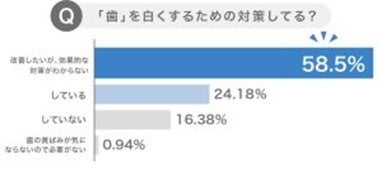 そこで、「歯」に対してどのようなコンプレックスがあるのかを伺うと、1位は「黄ばみ・着色」、2位は「歯並び」、3位は「詰め物や銀歯」という結果になりました。また、「黄ばみ・着色」が気になると回答した方に向け、対策をしているか聞いてみると、約60%が「効果的な改善方法がわからない」と回答しました。