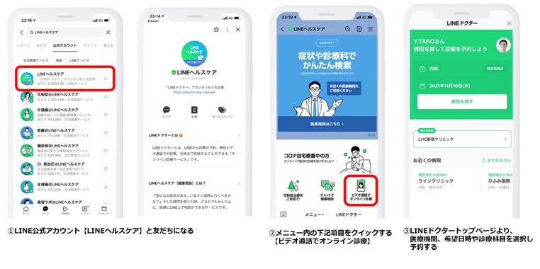 (3)「LINEドクター」トップページより、受診を希望する医療機関を検索し診療希望日と診療科を選択し診療に必要な情報を入力、決済方法の指定や保険証の登録、処方せんの送付方法などを指定いただき予約、当日ビデオ通話にて診療する