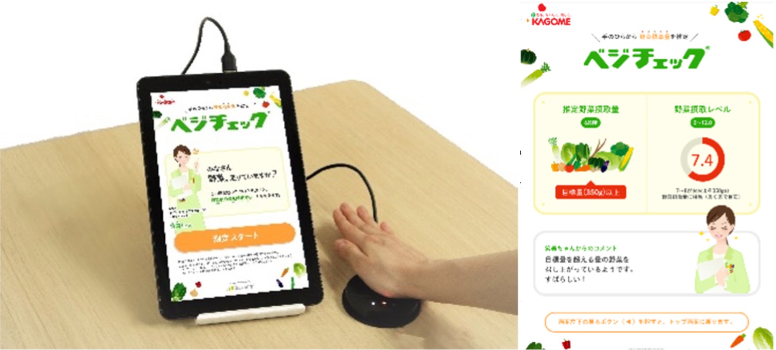 同社が開発したセンサーに手のひらを当てるだけで野菜摂取レベルや推定野菜摂取量を測定することができる「ベジチェック」により、参加者が自身の推定野菜摂取量を知ることや、食生活改善活動の成果を実感することで、対象者の行動変容を促すことを補佐します。