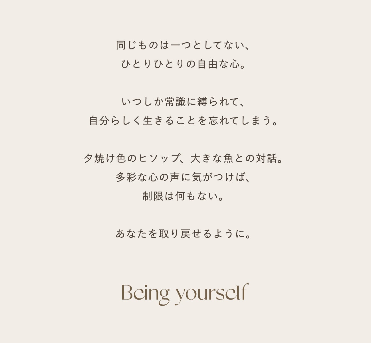 私たちは生まれた時には自由な心を持っています。しかし社会や周囲の環境によって「こうあるべき」という考えを身につけて、本来の”あるはずの”可能性を失ってしまう。例えば容姿や年齢、性別による「こうあるべき」という価値観や、他人軸で生まれた常識は、心を縛り付け意味がないものです。