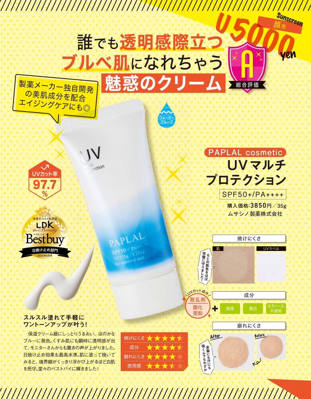 本音のコスメ批評誌「LDK the Beauty」2020年6月号にて日焼け止め部門 総合評価Aの【ベストバイ】を受賞!UVカット力、崩れにくさ等、高評価を得ました。