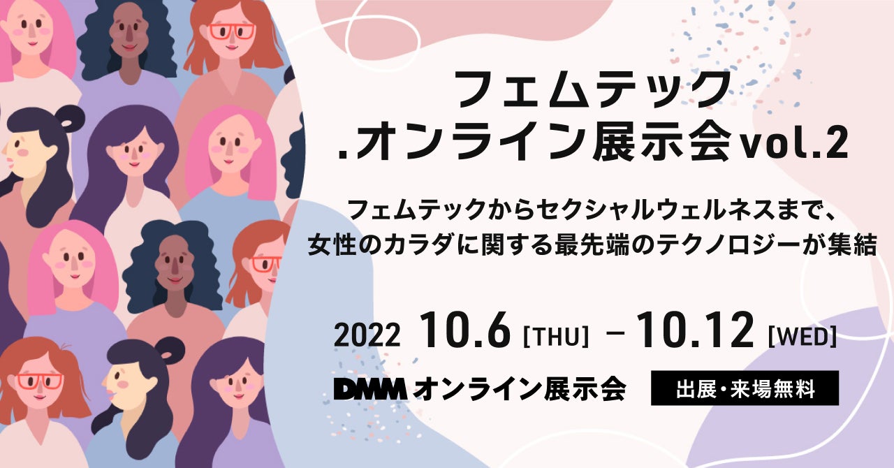 合同会社DMM.com(東京都港区、会長 兼 CEO 亀山敬司 以下、「DMM」)が展開するオンラインイベント事業は、2022年10月6日(木)から10月12日(水)までの期間で「フェムテック.オンライン展示会 vol.2」を開催することを決定しました。DMMオンライン展示会ではビジネスのお客様向けに展示会を展開してまいりましたが、今回は一般の方も来場対象に含め、あらゆる女性の身体とライフスタイルに寄り添ったサービスとの出会いを提供します。
