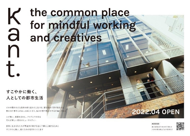 「Kant.」は、ワークラウンジ、オフィス、カフェ&ミュージックバーラウンジで構成される複合施設です。六本木徒歩1分という都心にいながら、自然を感じられる空間、人と交わすあたたかな会話や五感をひらくさまざまな体験を通じて、すこやかに働くライフスタイルを提案します。