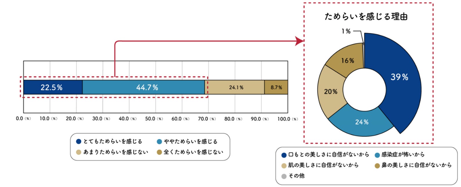 写真撮影時、約70%がマスクを外すことをためらい、その理由第1位は、「口もとの美しさに自信がない」。