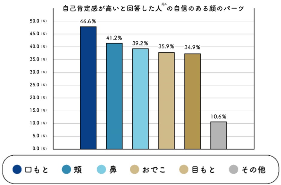 自信がある「顔のパーツ」を「口もと」と回答した人が、最も自己肯定感が高い傾向にあることが分かりました。パーツ順では、1位:口もと、2位:頬、3位:鼻という結果になり、マスクで隠れている部分に自信を持っている人と持っていない人で二極化していることが伺えます。その他、自身の「自己肯定感が高い」と回答している人の73.8%が、「口もとケアを重視している」と回答し、「自己肯定感がやや高い」と回答した人においては70.3%が、「口もとケアを重視している」と回答していることから、「自分への自信」と「口もとケア」の相関性も明らかになりました。