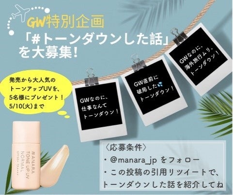 コロナ禍により、「今までのようにGWに海外旅行に行けない」、「GWなのに仕事が入っている」、「GW直前に破局を迎えてしまった・・・」など「GWなのにトーンダウン!!!」してしまうという方に、マナラ〈トーンアップUV〉で少しでも明るい気持ちになっていただきたく、マナラ公式Twitterにてプレゼントキャンペーンを開催します。GWは、特に日差しが強くなってくる時期なので、ぜひこの機会にゲットしてお試しください。