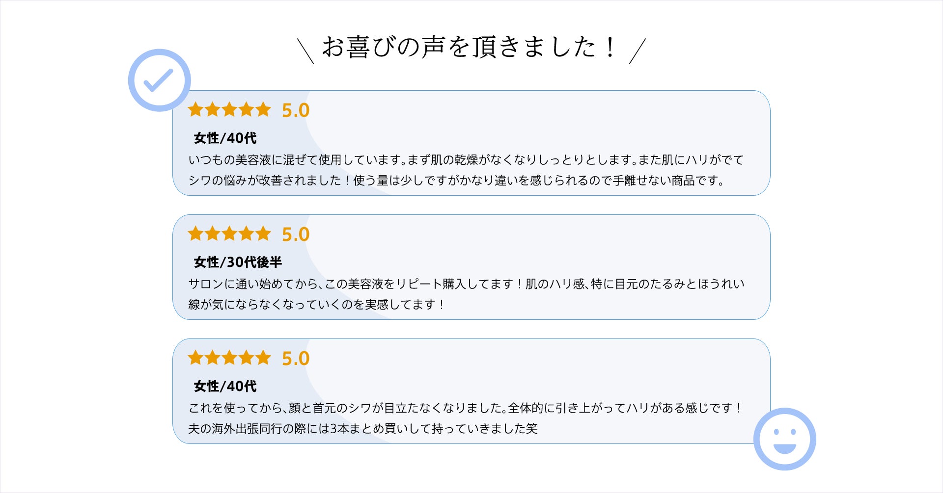 サロンに通い始めてから、この美容液をリピート購入してます!肌のハリ感、特に目元のたるみとほうれい線が気にならなくなっていくのを実感してます!