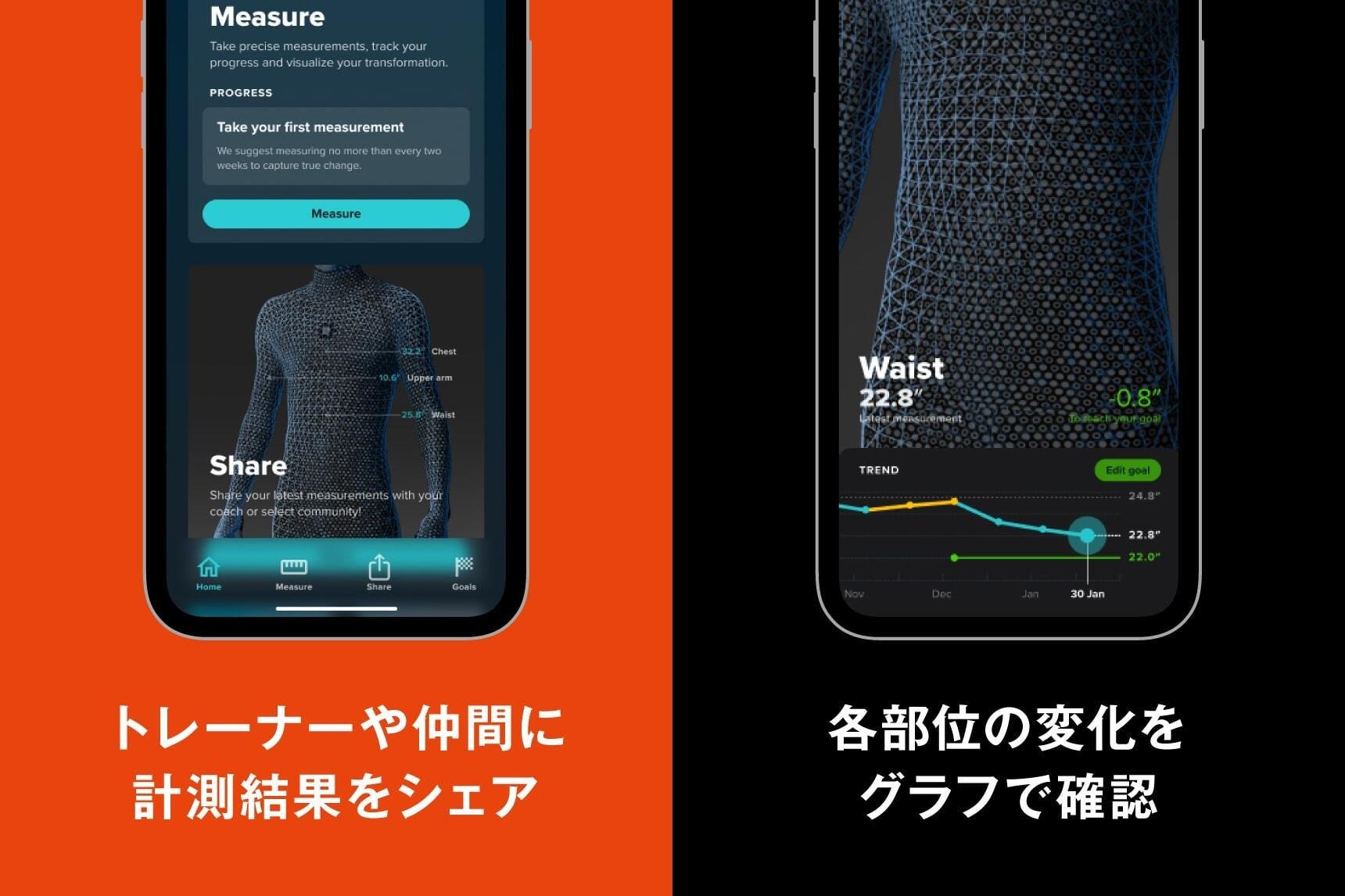 蓄積されたデータは、アプリ上で簡単にシェアすることができるため、トレーナーや一緒にワークアウトをおこなっている仲間に自身の身体3Dモデルをシェアしてアドバイスをもらうなど、様々な活用が可能です。