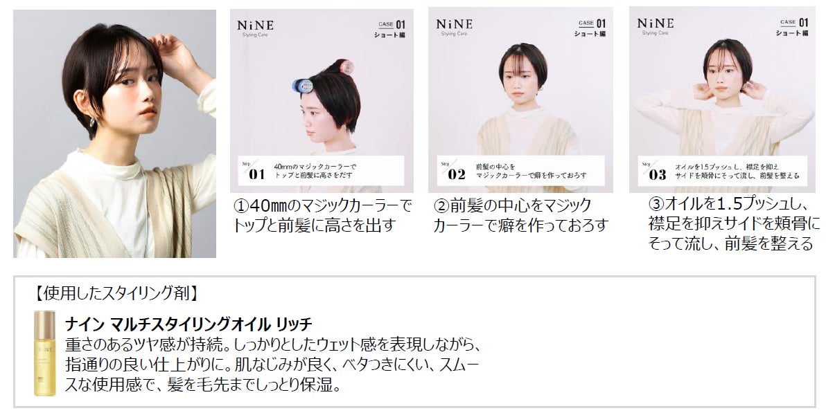いまトレンドの「S字ショート」や「パラパラ前髪」、「センター分けのふんわり前髪」など、試してみたいけど、自分でやるのは難しそう、時間がないから簡単に仕上げたい、といった方もいるのではないでしょうか?そんな方に向けて、NiNEのスタイリングシリーズを活用しながら、短時間で簡単にトレンドヘアが叶うヘアアレンジやテクニックを、髪のレングス別に「ショート編」、「ボブ編」「ミディアム編」の動画で、わかりやすくご紹介します。