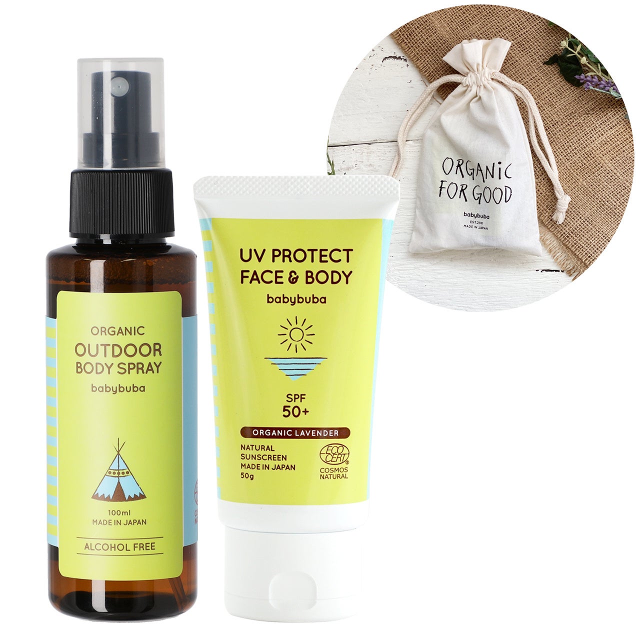 ・babybuba公式オンラインストアにて、アウトドアセット(アウトドア ボディスプレー 100ml + UVプロテクト フェイス & ボディ SPF50+)購入者全員に、ベビーブーバオリジナル巾着袋をプレゼント