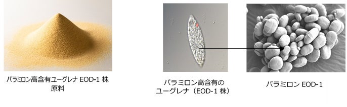 「パラミロン」は、微細藻類であるユーグレナのみが細胞内貯蔵物質として生成する高密度の不溶性食物繊維です。「パラミロンEOD-1」とは、ユーグレナの中で(株)神鋼環境ソリューションが特許を取得している新規株「ユーグレナEOD-1株」に含まれるパラミロンのこと。近年の研究により、精神的・身体的疲労感の軽減効果が認められています。