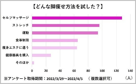 A.1位 セルフマッサージ、2位 ストレッチ、3位 運動、4位 食事制限、5位 痩身エステに通う、6位 健康器具を購入、7位 その他
